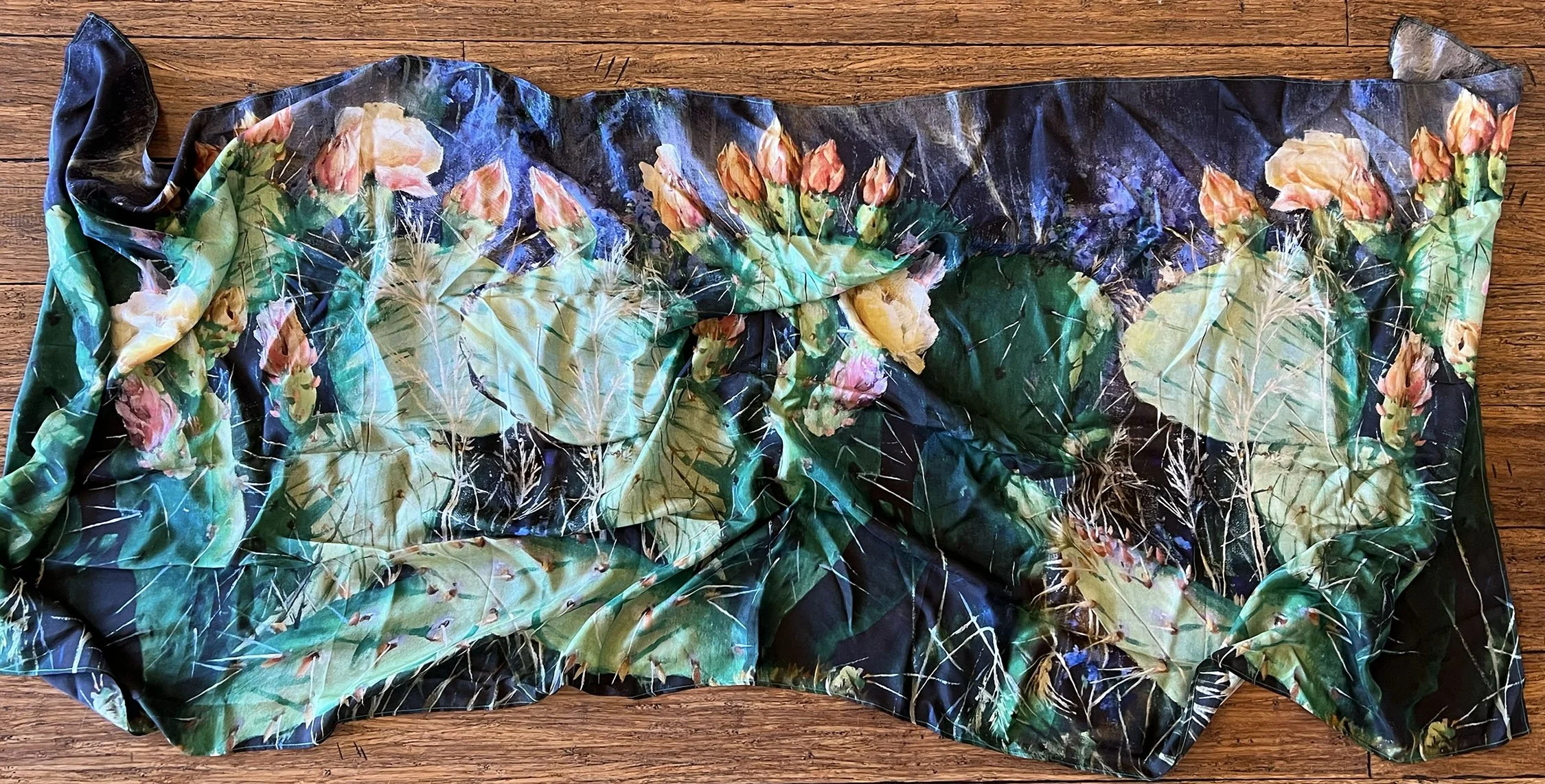 Silk scarf printed from a painting by Amery Bohling. This oversized shawl scarf features a prickly pear cactus in full bloom. The scarf is sent to you in a custom box making for a beautiful presentation.